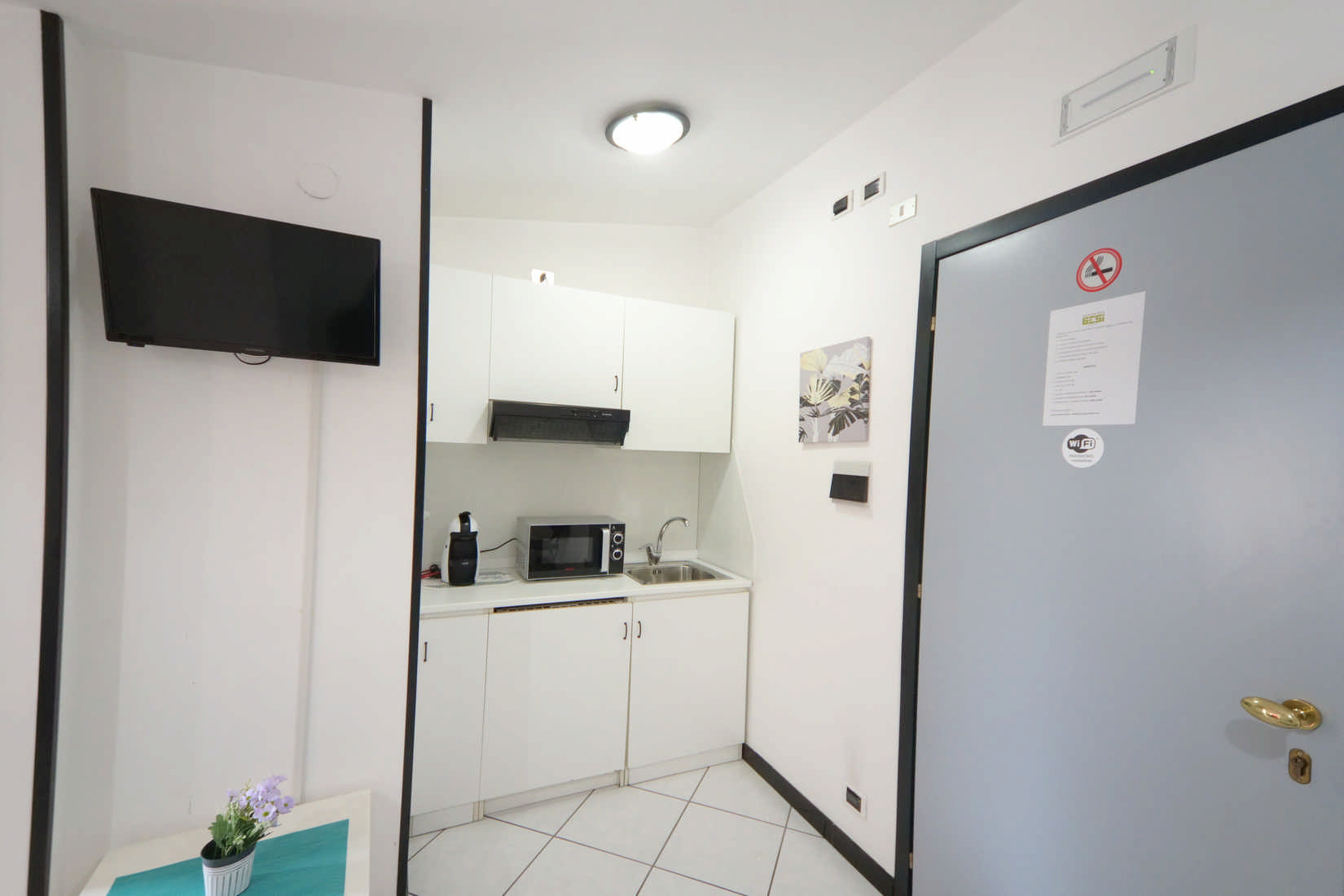 Zona living: fornetto a microonde, macchina Nescafé a capsule, frigo, lavello e tavolo con sedie.