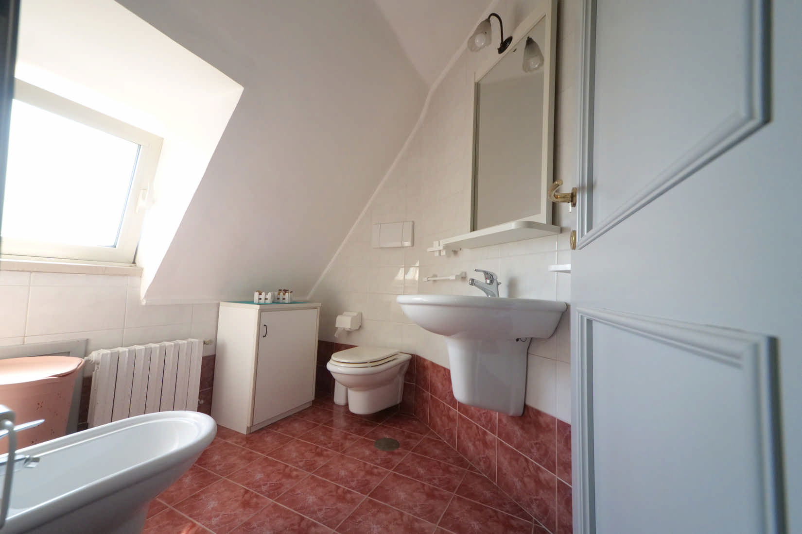 Bagno finestrato: lavabo, bidet, vaso, doccia.